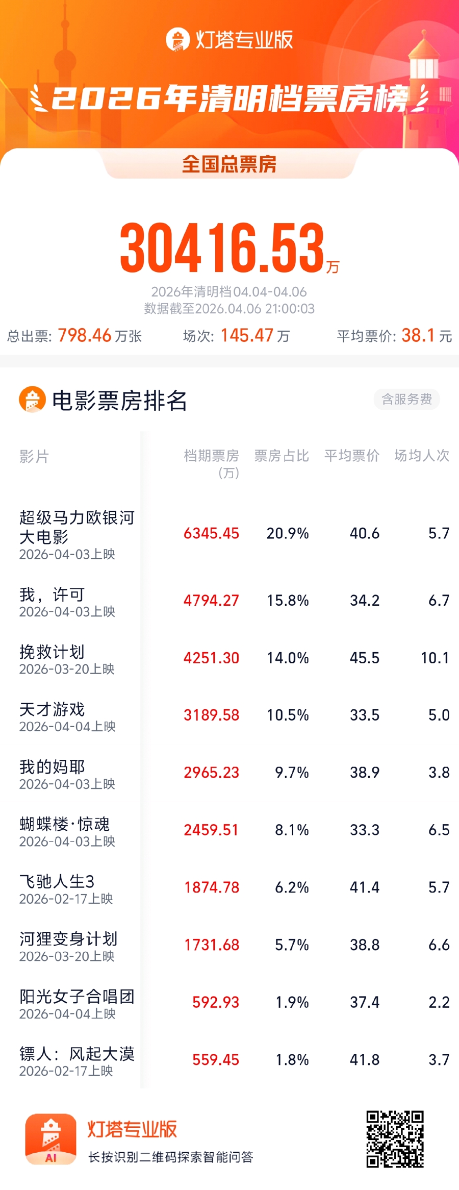 据灯塔专科版统计,放浪4月6日21时,2026年晴明档(4月4日-6日)票房3.04亿元,影片《超等马力欧星河大电影》成为晴明档票房冠军。