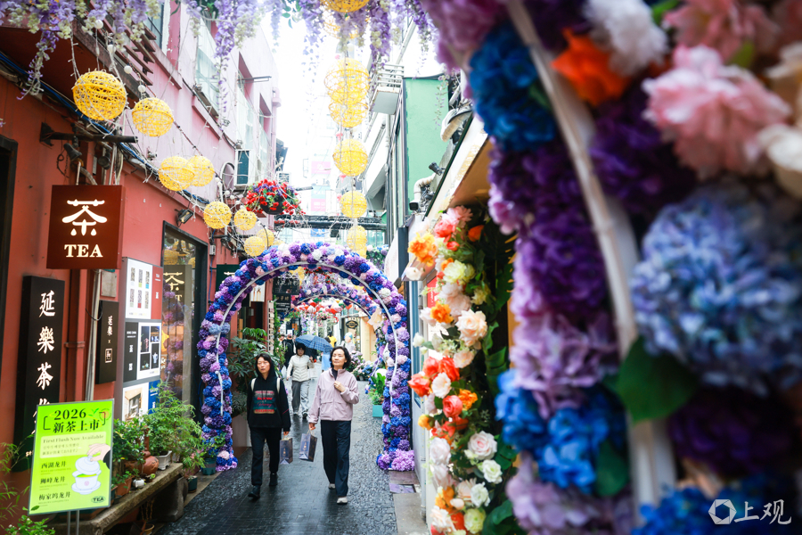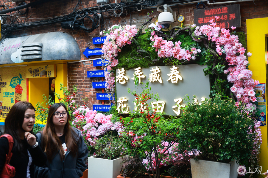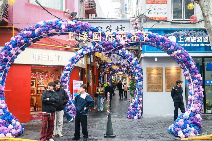 从田子坊1号门走进,旅客在粉紫色的花门间穿行,仿佛插足了一个上海扫尾版的童话天下。为借力好上海花草节这个大IP,田子坊地区经管办公室早谋划、早行径,请联想师在田子坊进出口、各人区域等处联想、打造了神气门头、花墙等花艺叮嘱,为旅客创造新的逛游体验。