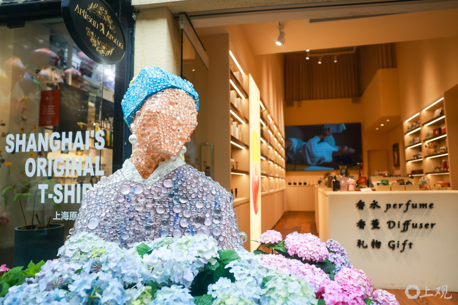 铆足干劲,每家店铺都拿出最好的创意。在“画色天香”小店门口,逐一簇簇蓝粉色的绣球开得正艳,花中摆着一个缀满“水点”的仙女形象作品,创意取自天下名画《戴珍珠耳饰的仙女》,诱惑不少旅客停驻来。“画色天香”店长王博宇告诉记者,咱们运转选购了一批花草摆在门口,但以为少了点什么。店铺投资东说念主就“手搓”了这个仙女形象的作品,作品上掩饰的“水点”都是手工一颗颗拼粘上去的,用了近两个星期完成。