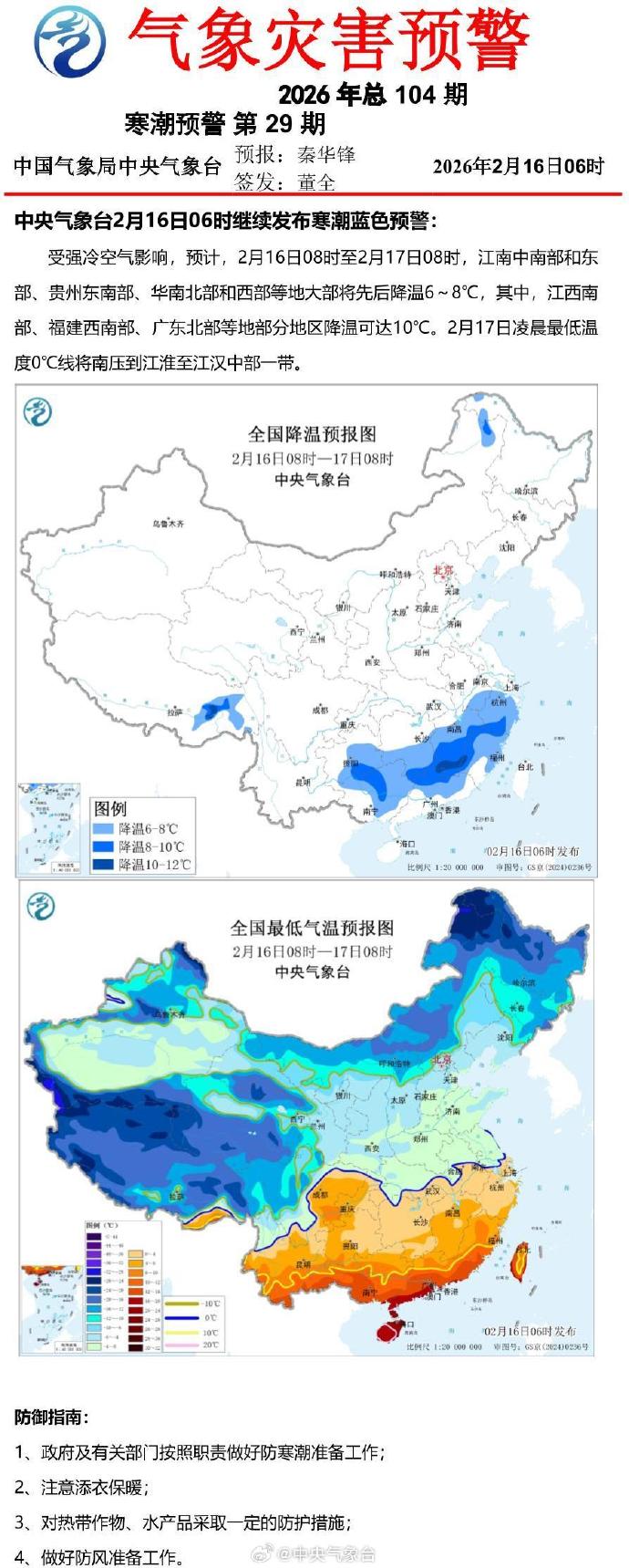 中央气候台2月16日06时不绝发布寒潮蓝色预警。