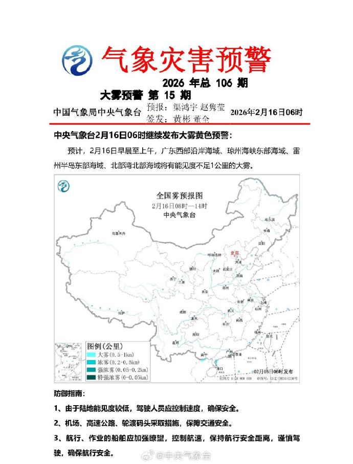 中央气候台2月16日06时不绝发布大雾黄色预警。