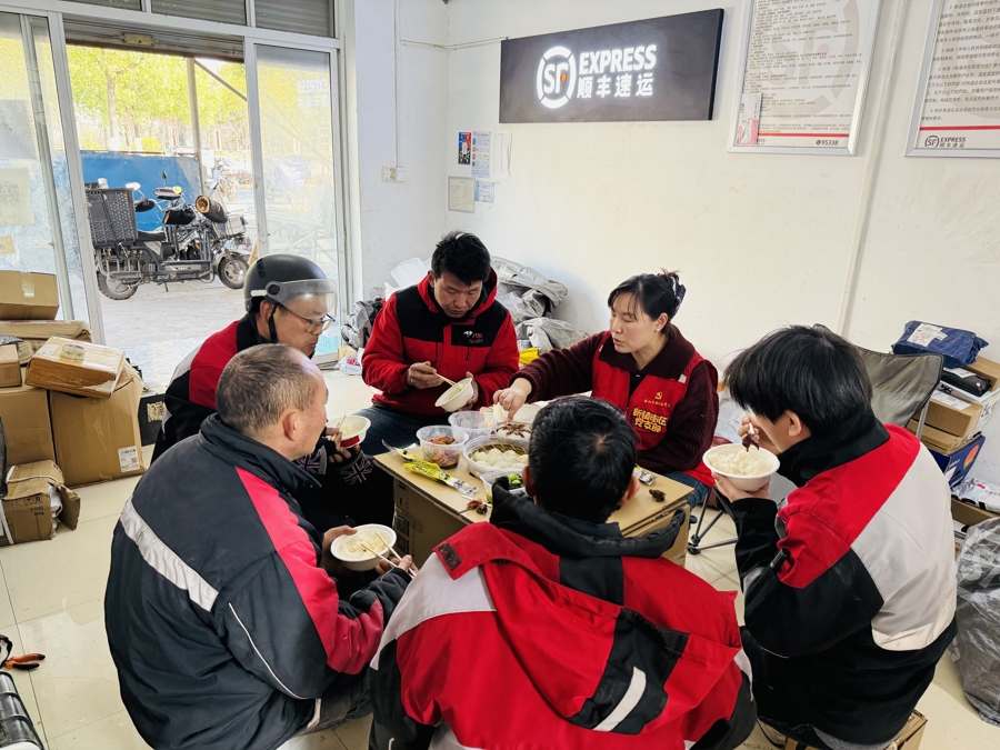 饭香氤氲间,责任主谈主员与快递小哥们围坐在沿途,一场当先山海的“年味共享会”悄然张开。
