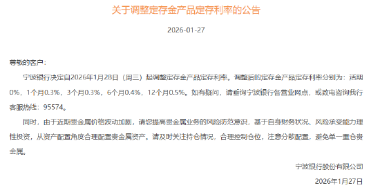 1月28日金融一线消息,宁波银行近日发布公告称,自2026年1月28日(周三)起调整定存金产品定存利率。调整后的定存金产品定存利率分别为:活期0%,1个月0.3%,3个月0.3%,6个月0.4%,12个月0.5%。