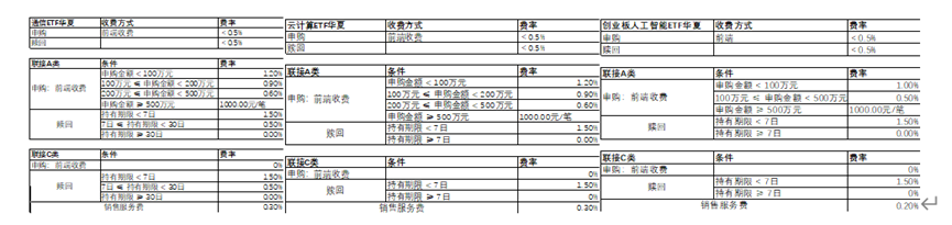 注:以上所说起ETF均不收取申购费、赎回费、销售作事费,申购赎回代理机构可按照不超越0.5%的圭臬收取佣金,其中包含证券来回所、登记结算机构等收取的关系用度;此外,关系ETF及鸠合的照拂费率和托管费率如下所示: