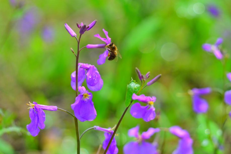 小蜜蜂循开花香而来,在花丛中翩跹起舞,紫花、绿影、蜂鸣奇妙无比。