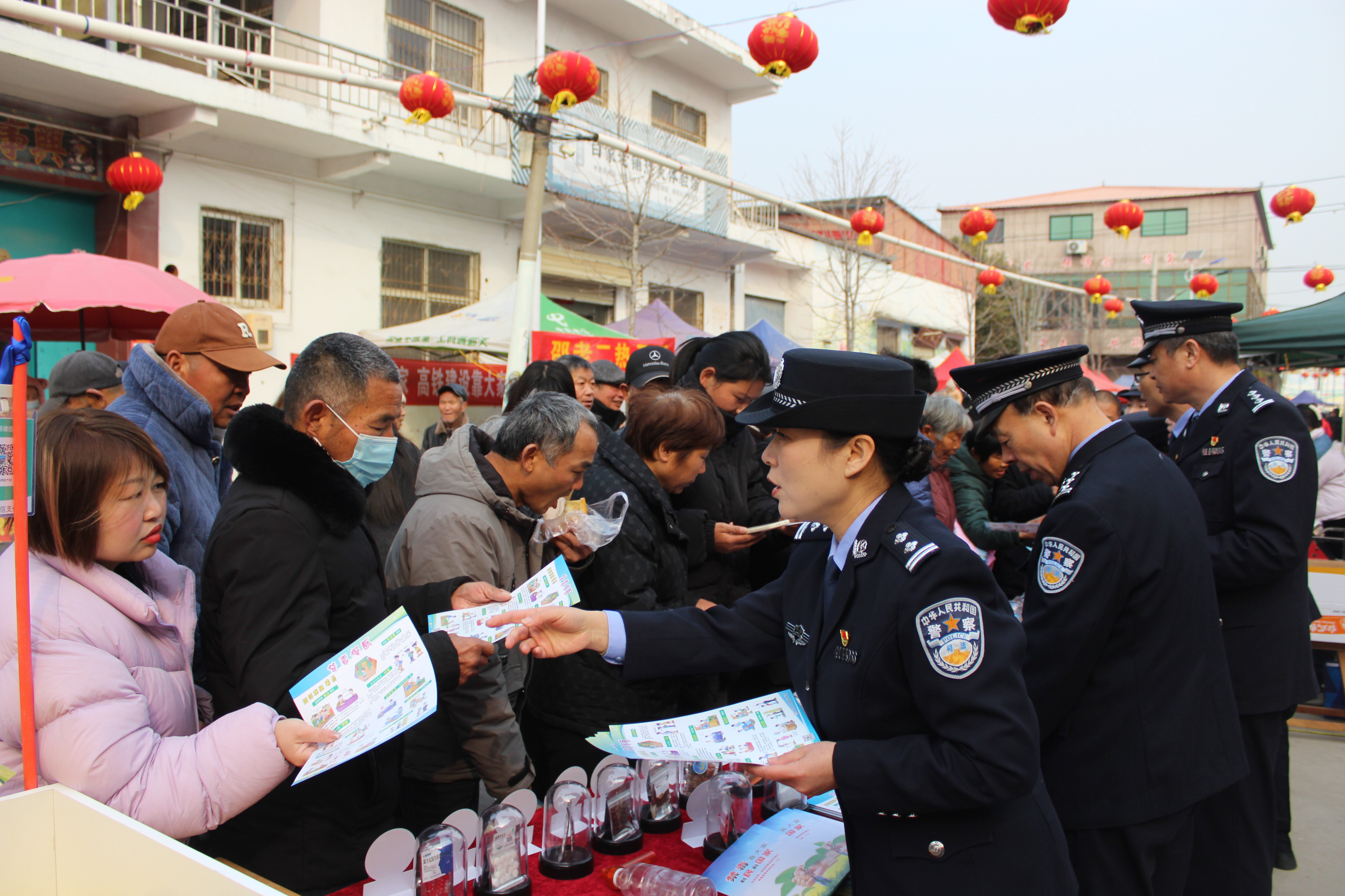2025年2月18日,在河南漯河黑龙潭镇老应村庙会上,王妙丽(右三)和共事向大众宣传禁毒常识。新华社发