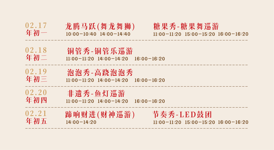 春节畸形买卖技艺:2月16日(除夜)10:00-17:00;2月17日(月朔)-2月23日(初七)10:00-21:30