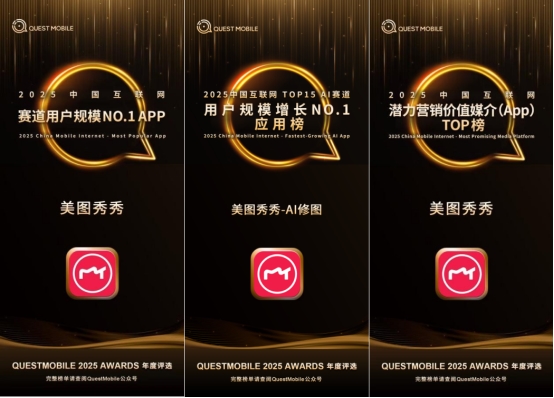 此外,美图秀秀还是2025中国AI图像处理赛道的用户规模增长第一名和2025中国图片美化行业的潜力营销价值第一名。