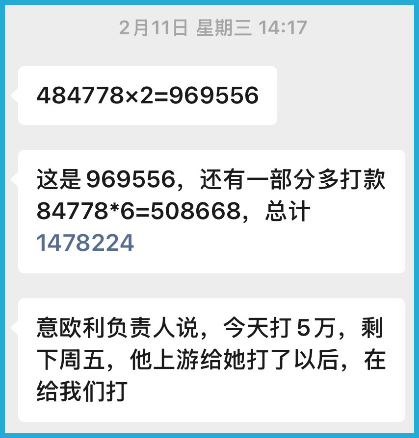 因屡次线上雷同无果,宋先生等东谈主近日从河南驱车前去上海,与意欧利公司迎面交涉。宋先生告诉记者,意欧利方面暗意,抖擞在2月11日打款5万,剩下的要比及“上家”给公司打款之后,能力给咱们。2月11日,5万元如约到账。