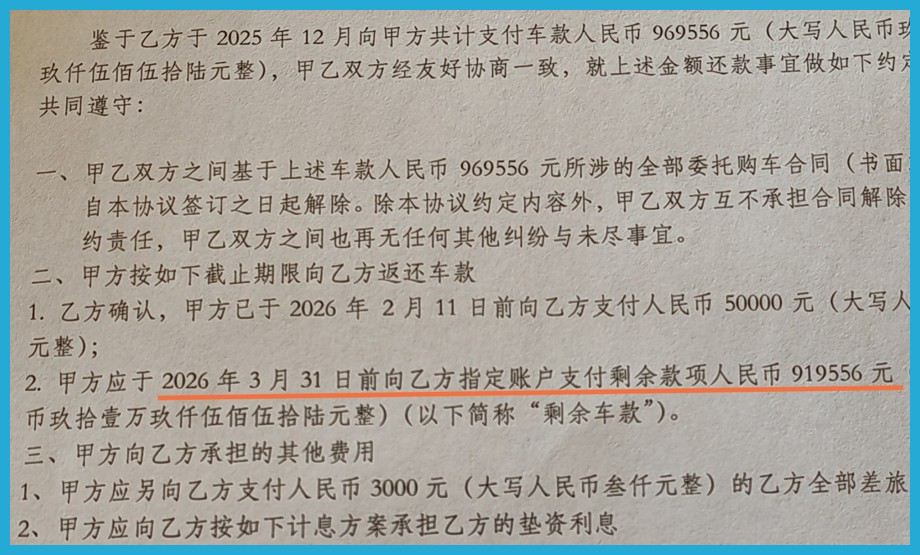 星速优配关于剩余约143万元款项迟迟未返还的原因,宋先生说,据他掌抓的信息,“意欧利”是中间商,其上还有“上家”,押金可能还卡在“上家”那边。不外,意欧利方面暗意,抖擞先行垫付其中一部分款项919556元,并将此高兴写入合同。两边于2月11日签署《退款契约书》,意欧利公司书面高兴,于2026年3月31日前返还这部分金额,并承担3000元差旅费及这部分金额利息。