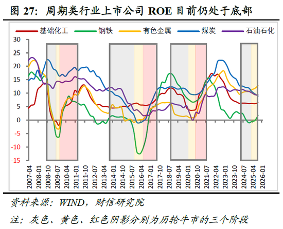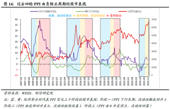 根据DDM模型,股票价格是企业未来现金流的现值,取决于盈利、无风险利率与风险溢价三大核心变量。历史数据表明,PPI与A股企业盈利高度正相关(见图15),其由负转正周期均对应着A股的牛市行情(见图14)。但值得注意的是,牛市起点通常领先于PPI的绝对低点,初期上涨主要由无风险利率下行与风险偏好修复驱动,随后沿“政策与流动性驱动→盈利预期与流动性双轮驱动→盈利兑现驱动”的典型三阶段路径演进。本文依据PPI同比增速与M1增速(表征流动性)的不同状态,将过往四轮A股牛市行情划分为三个阶段(见图14):