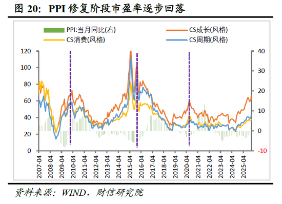 阶段三(牛市尾声期):周期消费占优。PPI转正上行后,估值支撑减弱(见图20),盈利驱动成为关键。上游周期行业盈利弹性随价格快速释放,消费板块以稳健增长消化估值压力,两者表现强势;科技成长因盈利相对优势减弱、估值驱动乏力而普遍承压。过去三轮牛市第三阶段,周期与消费板块均2次位列涨幅前二且获超额收益,科技成长板块则有一半的时间出现负收益(见图19)。