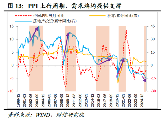 当前PPI回升主要集中在少数上游行业,呈现明显的结构性特征。历史数据显示,PPI同比增速与上涨行业数量比重呈正相关(见图12),这意味着价格能否顺畅地由上游传导至中下游,是决定PPI回升幅度与持续性的关键。而这一传导机制能否畅通,根本上取决于终端需求的恢复程度。