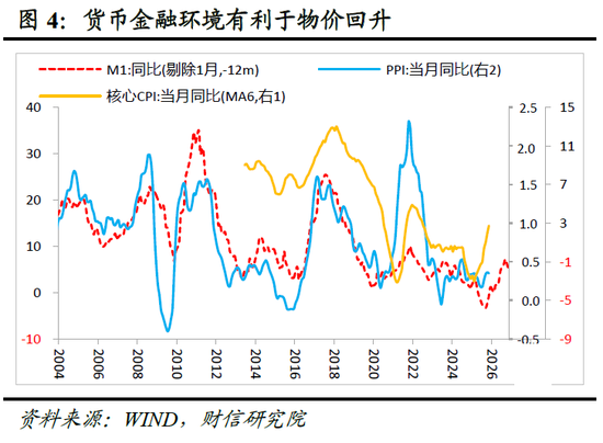其二,金融流动性环境改善。M1增速是观测实体部门资金活跃度与短期需求的关键指标,其对PPI与CPI同样具备约12个月的领先性(见图4)。在相对宽松的金融环境下,M1增速已于2024年四季度触底回升,这预示着实体部门交易与投资意愿正在复苏,将对后续物价的回升形成有效拉动。