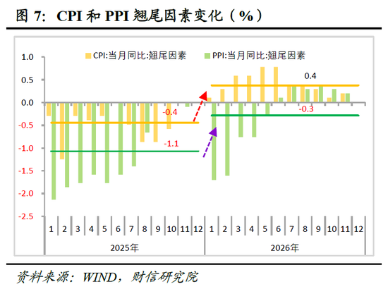 其一,低基数效应提供明确上行支撑。根据2025年环比走势测算,2026年CPI与PPI的翘尾因素中枢预计分别为0.3%与-0.4%,较2025年均提高约0.8个百分点(见图7),将对同比增速形成直接向上拉动。