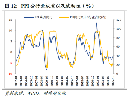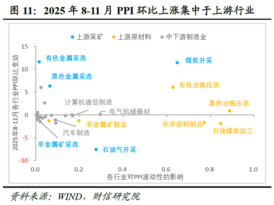 其次,近期“反内卷”政策的效果也率先在上游显现。2025年8-11月,PPI环比上涨的行业高度集中于上游行业,可概括为“二黑一色”,即煤炭、黑色金属及有色金属(见图11)。具体而言,煤炭与黑色金属的价格回升主要受国内“反内卷”政策驱动;有色金属则更多得益于全球AI及绿色转型的需求拉动。值得注意的是,此轮上涨中传统的石化(石油+化工)板块缺席,且多数中下游行业环比仍未止跌,显示出本轮初期的回升动能在上游内部也存在分化,且向产业链中下游的传导尚不顺畅。