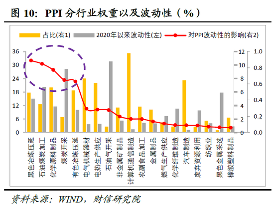 首先,上游行业历来是影响PPI走势的关键。PPI统计涵盖40个工业行业大类,为量化各行业影响,需综合考量其权重与价格波动性。以各行业营业收入占比近似替代权重,以2020年至今各行业PPI同比的标准差衡量波动性,两者乘积可评估其历史影响程度。测算显示,过去五年对PPI走势影响最大的前五大行业全部集中于上游,依次为黑色金属冶炼及压延加工业、石油煤炭及其他燃料加工业、化学原料及化学制品制造业、煤炭开采和洗选业、有色金属冶炼及压延加工业(见图10)。这五大行业在2024年的营业收入权重合计仅占约25.3%,却贡献了2020年以来PPI整体波动率的60%以上,其价格高弹性特征显著。