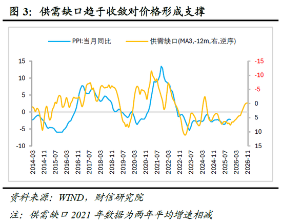 其一,供需缺口呈收敛态势。价格本质上是供需相对变化的体现。为此,我们构建供需缺口指数,以制造业投资增速表征供给,以社零、非制造业投资及出口增速综合表征需求,两者之差即为供需缺口。历史数据显示,该指数对PPI同比具有约12个月的领先性,且两者反向变化。自2024年底以来,供需缺口已从高位回落,这预示着未来物价回升具备一定的基本面基础(见图3)。