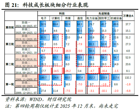 阶段一(牛市启动期):科技成长先行。该阶段市场主要由流动性与宏大叙事驱动,PPI仍在回落,估值修复是核心逻辑。科技与先进制造板块因对PPI价格敏感度低(盈利相对占优,见图18)、远期成长空间广阔、估值修复弹性大,成为资金首选。数据显示,过去四轮牛市第一阶段,申万科技风格指数收益率均位列前三且全部跑赢万得全A;先进制造板块3次进入前三,充分受益于风险偏好回升与估值扩张(见图19)。