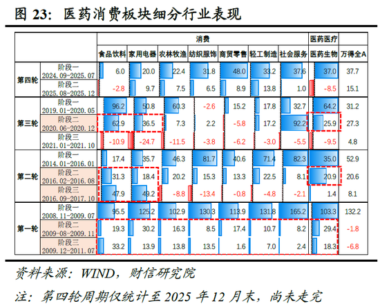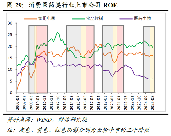 阶段二(牛市展开期):消费医药接力。随着PPI降幅收窄,盈利修复预期升温,市场风格趋于均衡。消费与医药板块凭借盈利稳定性与估值合理性,成为资金增配的重点方向,过去三轮牛市的第二阶段中,医药与消费板块的收益率均稳居前三(见图19)。