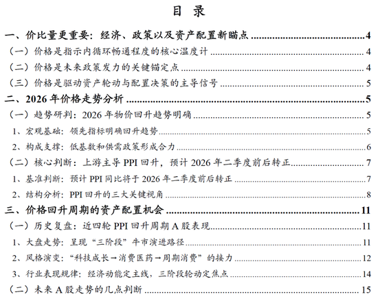 当前,宏观分析的重心正从“量”转向“价”。“价格”已成为观测内循环畅通程度、预判政策方向、乃至驱动资产轮动的核心变量。我们判断:PPI将于2026年步入上行周期,并由上游主导。这一趋势将根本性地重塑盈利格局与市场风格。本报告旨在厘清价格回升的路径与驱动力量,并基于历史周期的深刻复盘,为2026年A股布局提供关键研判。