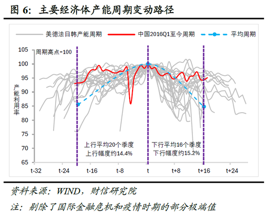 其四,产能周期有望步入上行阶段。产能利用率反映实际产出与潜在产能之比,其上升通常指向供需关系趋紧,对工业品价格形成支撑。国际经验显示,典型产能下行周期平均持续约16个季度(基于美德法日韩等国共25轮周期统计,见图6)。我国本轮产能利用率自2021年二季度见顶后进入下行通道,截至2025年底已持续18个季度,时长已超过国际平均水平。尽管国内产能利用率波幅小于海外,但结合当前所处的周期阶段与“反内卷”等供给端政策的持续推进,预计产能利用率有望于2026年企稳回升,从供给侧对物价回升形成支撑。