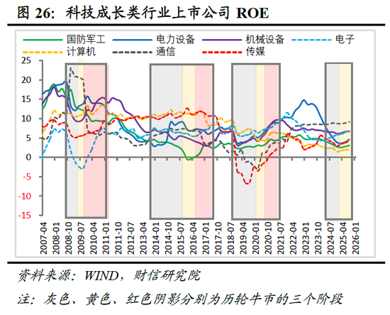 第二,电子行业展现出跨周期领先韧性。电子是过去三轮牛市中唯一在所有三个阶段均录得正收益、且涨幅稳居前三的行业(见图21-22)。其长期跑赢的底层逻辑在于:一方面,作为制造业的关键组成部分,其景气度伴随整体经济复苏而回升,具备顺周期属性;另一方面,持续的技术创新与国产替代趋势,为其提供了独立于宏观波动的长期成长动力。