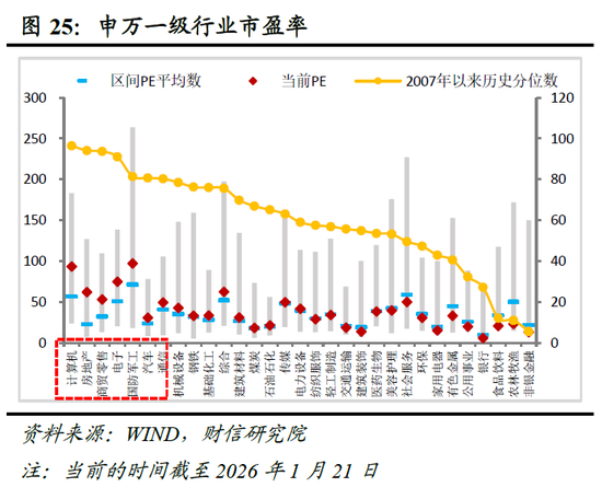 第二,上半年市场主线仍将围绕新质生产力展开,计算机、电子、军工、电力设备为核心抓手。AI引发的技术革命已成为定义本轮经济周期的核心动能,其颠覆性影响将赋予科技板块超越历史周期的超额收益潜力。尽管当前计算机、电子等行业PE处于历史90%以上高位,估值扩张动能趋弱,但其盈利底部修复将接棒成为核心驱动力,或仍有表现空间(见图25-26)。同时,在“安全优先”背景下,军工板块景气度确定;电力设备则兼具估值合理性与盈利修复弹性。