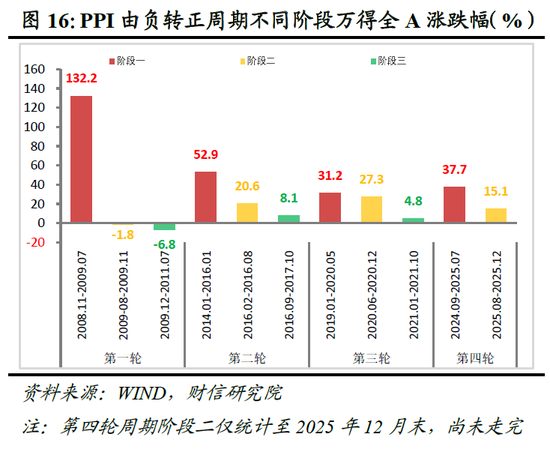 此为市场由估值修复向业绩验证过渡的关键期。上涨动力从前期的流动性单轮驱动,切换为盈利修复预期与流动性支撑的双轮驱动。企业盈利随PPI降幅收窄出现改善迹象,但由于估值已从底部显著抬升,市场对利好的敏感度下降,上涨动能较第一阶段明显收敛(见图16)。指数多表现为涨幅放缓或进入震荡整固期,以消化估值压力并等待盈利数据的进一步确认。
