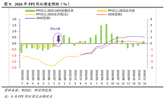 基于上述审慎分析,我们对2026年PPI环比走势设定两种情景:情景一,假设2026年全年PPI环比均为0%;情景二,假设PPI环比增速能达到2015-2016年供给侧改革时期约两成的水平(自止跌首月起计算相同时间跨度,幅度与2025.08-12月均值相当)。估算结果显示,在上述情景下,2026年PPI同比增速中枢分别为-0.3%与0.3%,实现同比转正的时点分别约为5月与4月。两种情景均显示PPI同比将于2026年二季度左右转正,且回升态势呈现“上半年上行较快、下半年趋于平稳”的特征(见图9)。