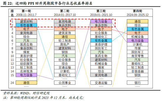 第一,领涨行业是宏观经济动能切换的核心映射。历史数据表明,过去四轮牛市中涨幅居前的行业,均精准对应了当期驱动经济增长的核心引擎与战略重心(见图22),体现了市场对生产要素重新配置、产业结构关键跃迁方向的集中定价。具体而言:2008-2011年建筑材料、有色金属领涨,对应“四万亿”刺激下资源与基建的强周期扩张;2014-2017年切换至家用电器、食品饮料,反映工业化后期消费升级的主导地位;2019-2021年电力设备、食品饮料涨幅居前,体现市场对“绿色转型+消费提质”双主线的深层定价;当前阶段以通信、有色金属、电子为代表的新质生产力行业,逐步取代传统板块成为新的领涨力量,映射新旧动能加速转换的演进趋势。这一规律揭示了牛市超额收益的关键,在于紧扣经济动能转换的战略方向。